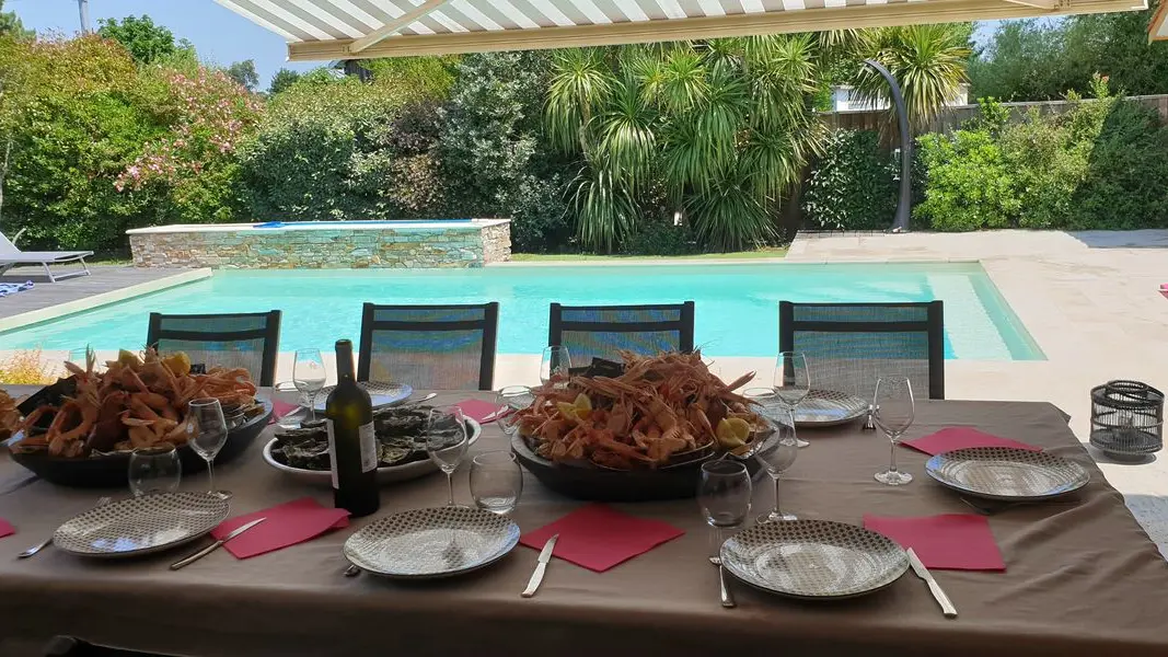 You'll discover a 9x4.5m heated swimming pool with roller shutter, a 130m² terrace with garden furniture, deckchairs, a patio with a large outdoor table, a charcoal barbecue, 8 adult bicycles, a ping-pong table, a pétanque court.