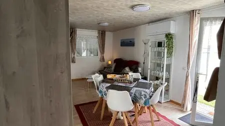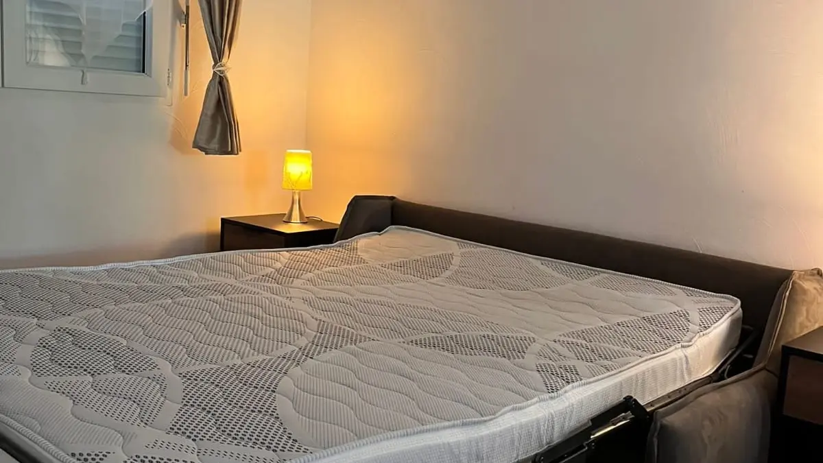 La zona de estar y dormir incluye un cómodo sofá convertible con colchón incorporado (ancho 160 cm), armario, mesa redonda con 4 sillas. TV, Wifi.