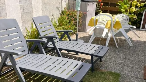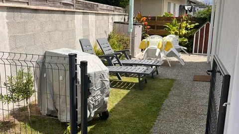 Terraza: mesa redonda y 4 sillas, sombrilla, 2 tumbonas y barbacoa.